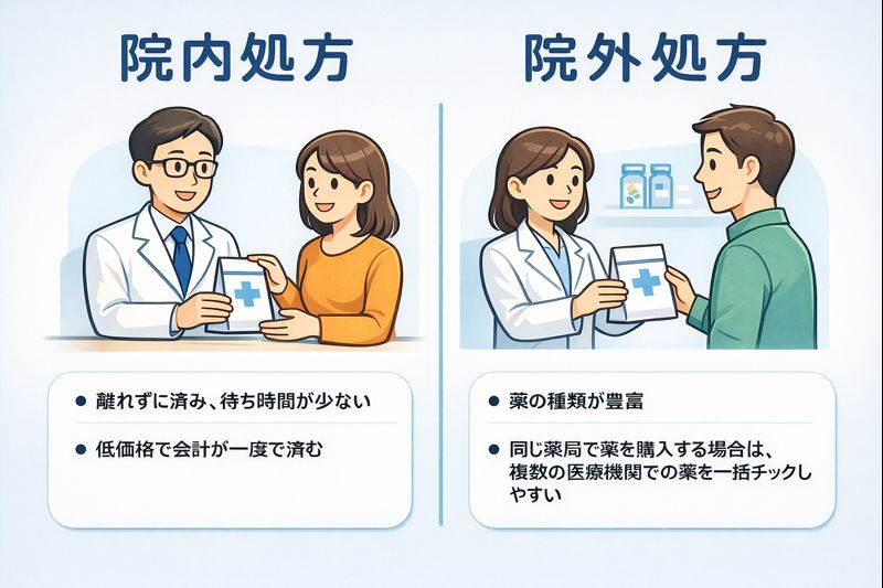 その場合には、より適切にお薬をお渡しするため、院外処方をお願いすることがあります。院内処方と院外処方は、同じ月内では原則としてどちらか一方のみとなります。